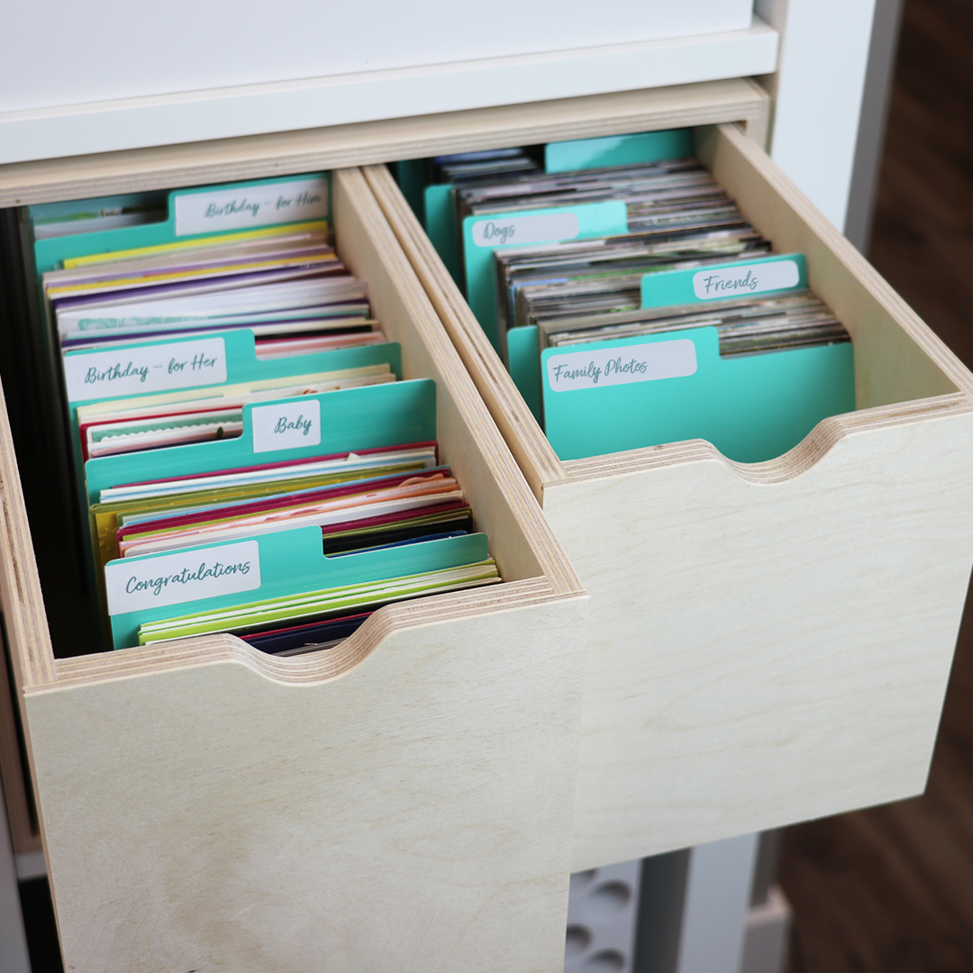 Whether you're storing photographs in the Card & Photo Drawer Cabinet or not, Card and Photo Dividers are essential for keeping your photos labeled and organized. You can label them by date, event, family member, or scrapbook project. The laminate is acetate free and makes changing labels a snap.