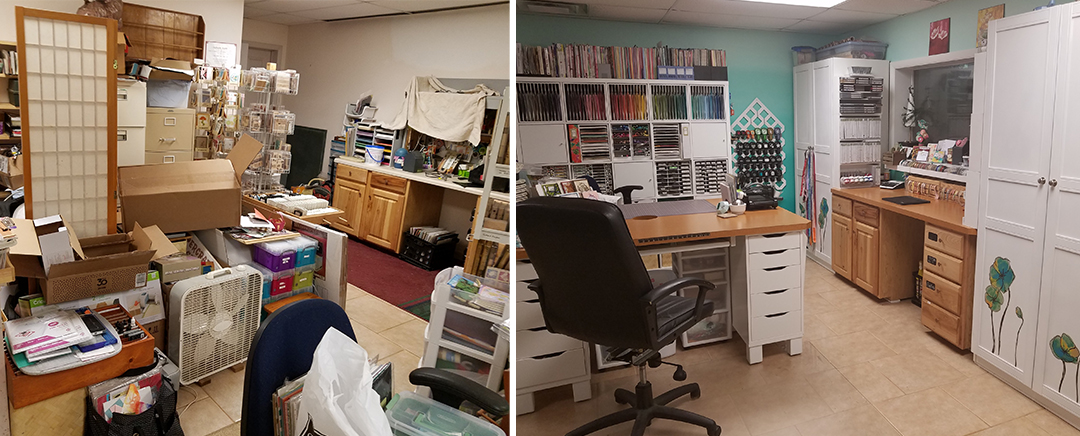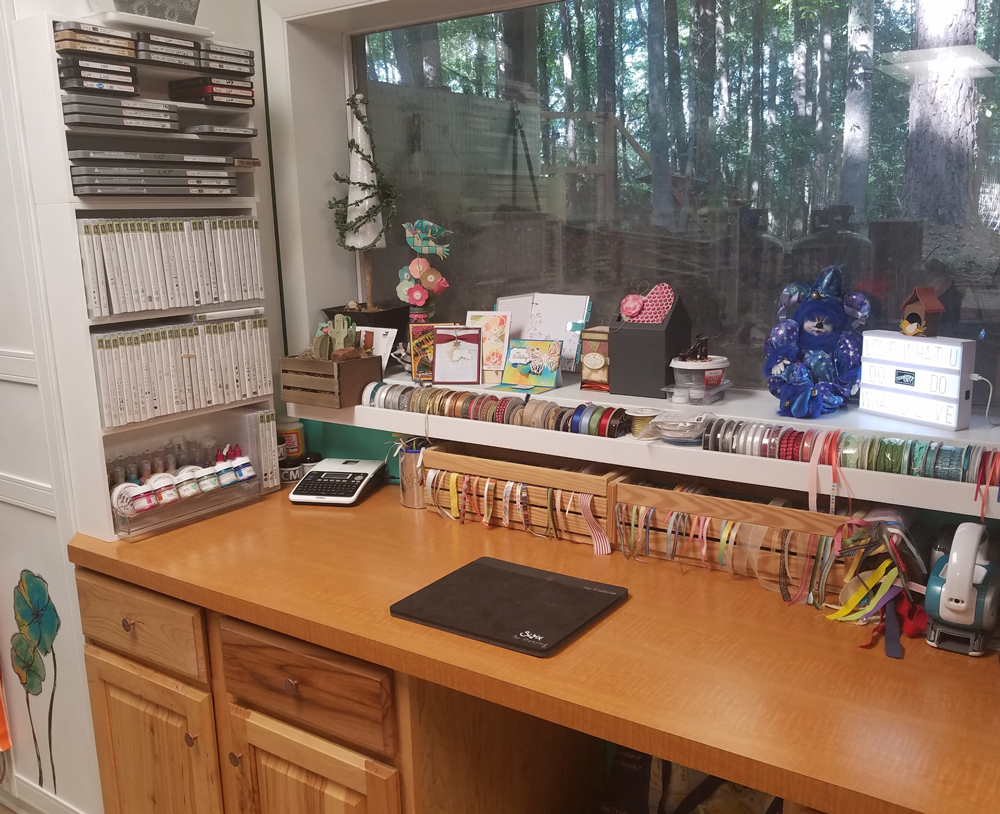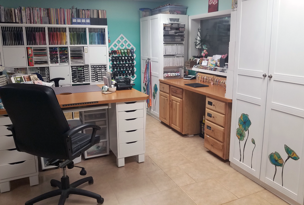 We are excited about the April Studio Showcase and how Lisa made the space uniquely hers. She loves creative expression and over the years Lisa has unleashed her creativity through ceramics, cross-stitching, quilting, water-coloring and paper crafting. "Paper crafting blends with my current age and environment" she says. When it came time to remodel Lisa's craft room, she recruited the help of her husband and daughter to make the space more efficient and organized.