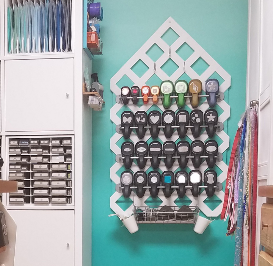 Lisa uses the Lock-Down Punch Holder for her lock-down punches. However, she also had a large collection of whale-tail punches. She decided to create a custom storage solution that her husband built using IKEA's towel rods and a mounting board that Lisa covered with a piece of lattice. She even painted the mounting board to match the gradient walls.