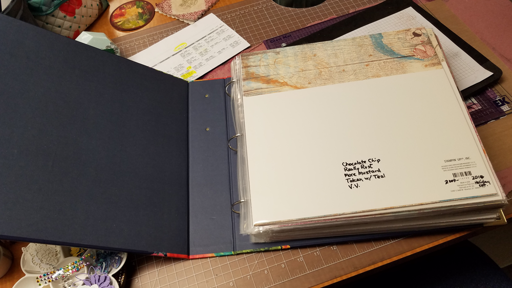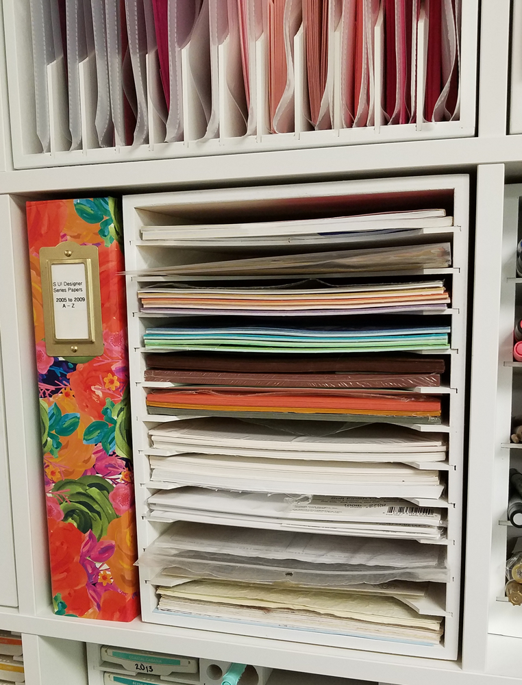 Lisa also has two 8.5x11 Paper Holders where she keeps her specialty paper packs. She utilized the extra space next to the 8.5x11 Paper Holder for a binder. "I found the space was the perfect size for my scrapbook binders where I store my SU! Decorative Specialty papers." The binder holds 12x12 full-sheet page protectors that Lisa has organized each paper pack in their sleeve by year and alpha so she knows which catalog to refer to for ideas.