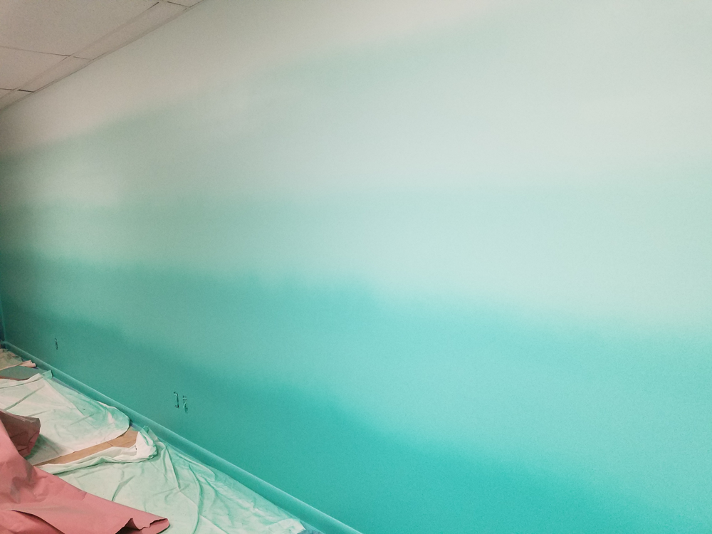 "I began watching video tours on Youtube of other craft spaces, and then asked my daughter to help me decide on wall colors." Teal is a favorite color for these two ladies. However, when Lauren, Lisa's daughter, researched the color online, she found several crafts spaces with teal walls. This didn't really fall in line with Lisa's idea to create something unique. Plus Lisa liked the darker teal, but Lauren liked a lighter teal because she felt darker would make the basement too cave-like. Then creativity was unleashed! Lisa was working on an ombre card and was inspired by the design. "What about gradient walls! I checked around the internet and found great instructional videos, but no craft rooms using gradients on their walls, so, YEAH!" It was a messy project but the results gave Lisa a space that had her own special spin.