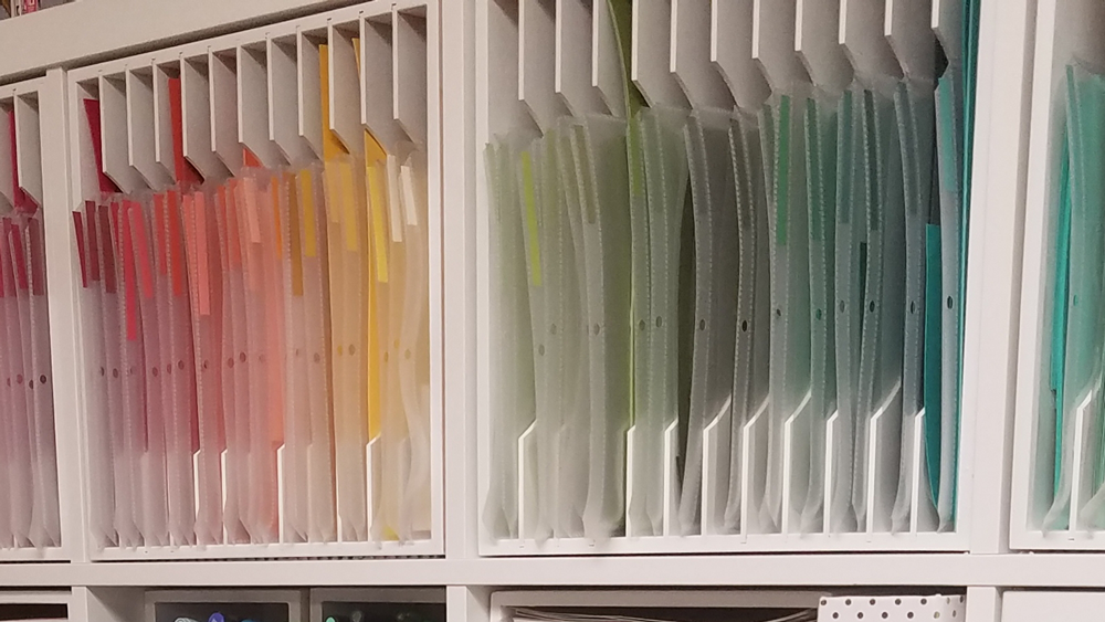 One of the first Stamp-n-Storage products Lisa purchased, and still her favorite, is the 12x12 Paper Holder. She added her 12x12 Paper Holders in the top row of the Kallax unit. "The Paper Holders are such a sturdy solution to paper organization! Most paper stacking systems out there are flimsy and/or plastic, and just not what I wanted for the backbone of my craft materials." Lauren suggested turning the 12x12 Paper Holders vertical to create a beautiful rainbow of color. Lisa uses Job Ticket folders from Office Depot to keep scraps together with the colors. The sleeves have tabs to slide a color into for easily identifying each sleeve.