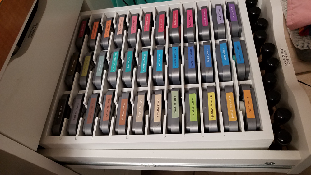 In order to not run out of desk space, Lisa put her Distress Ink Pad Holder in a drawer. It keeps her ink pads organized and she can easily pull out the holder. It also makes a great spot for storing blenders.