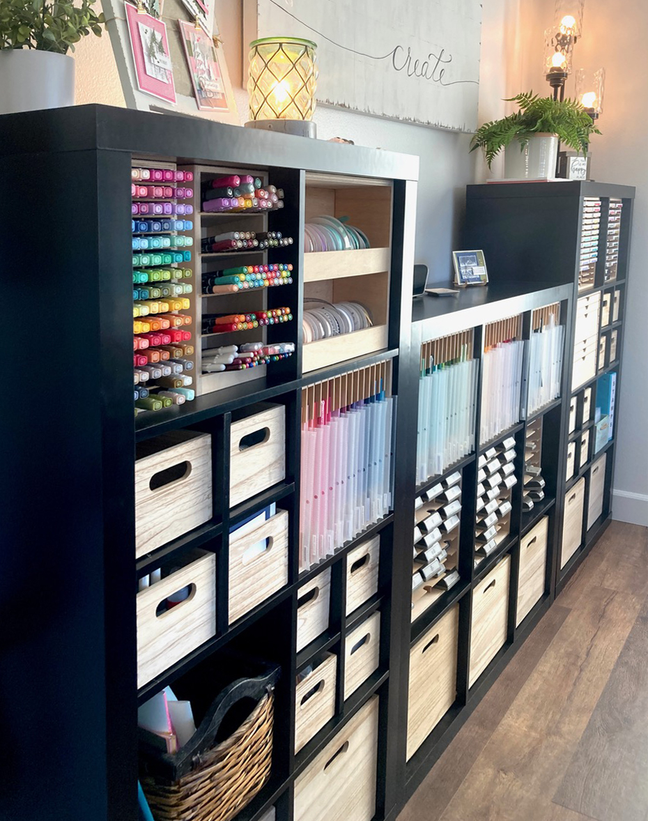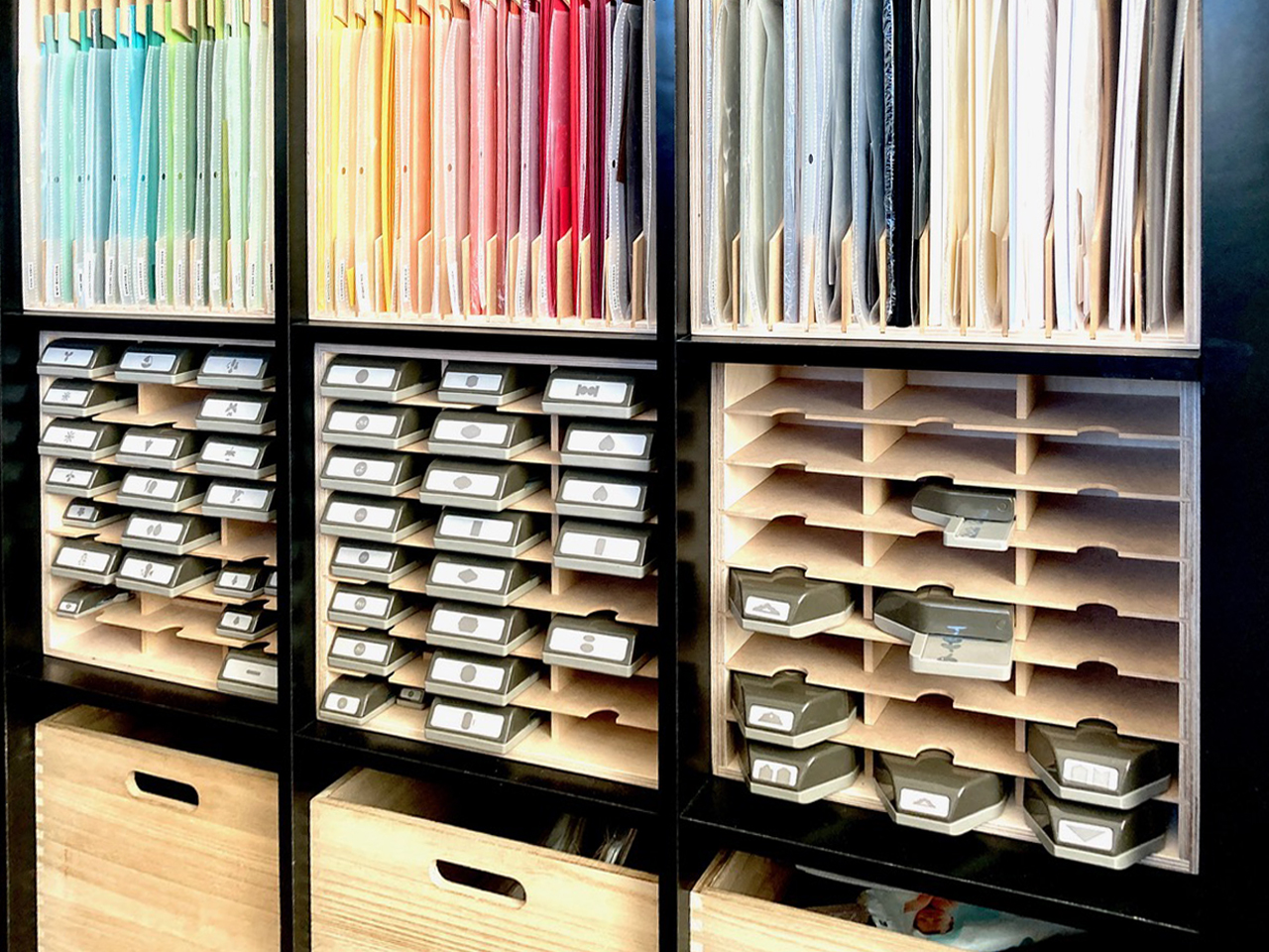 I love how my colors are in rainbow order. I have job tickets that I store scraps and label the color name. I love having all my colored cardstocks out in the open to help me get inspiration.