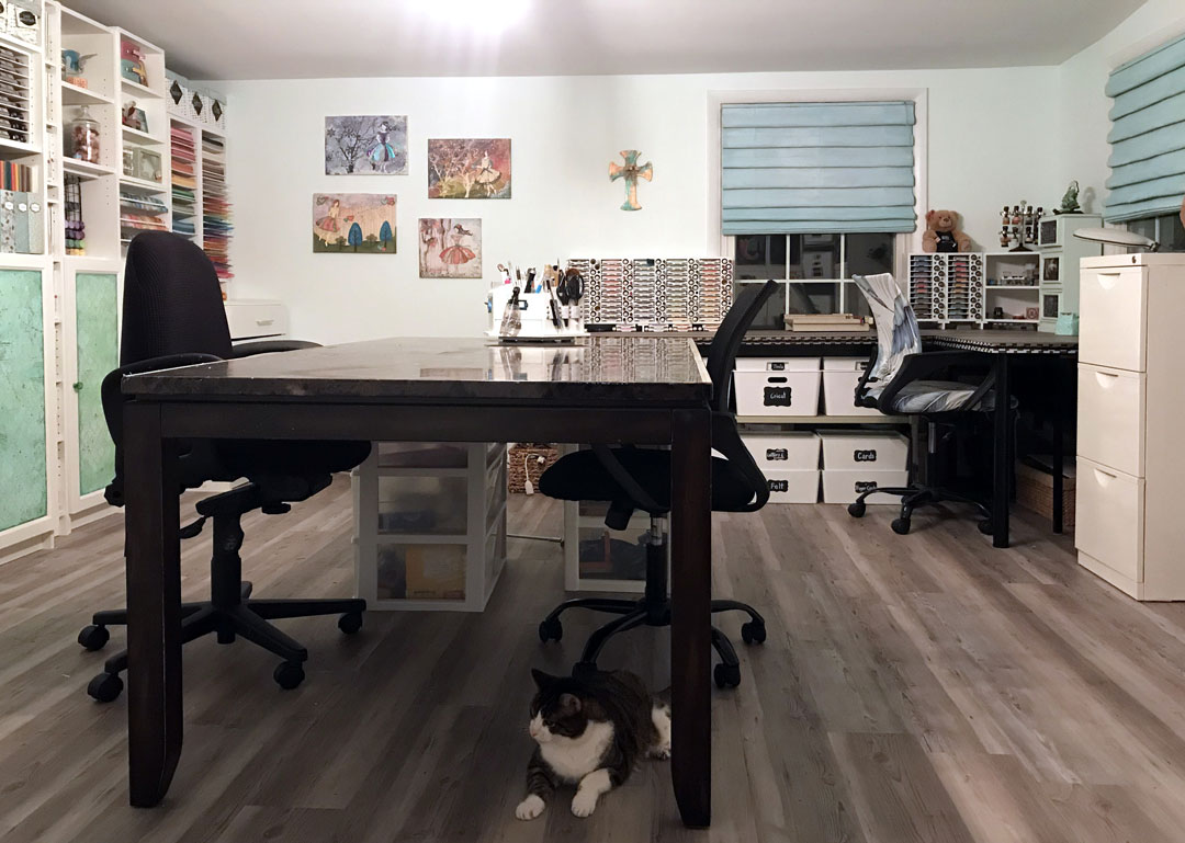 "When organizing many of my supplies in all of my new Stamp-n-Storage units, I wanted to make my art room “worthy” of them. After sorting, trashing, gifting, and recycling the supplies I didn’t need, I finally have a functioning, awesome art room. And my husband is happy to have our kitchen table, closets, and bedrooms cleared of all my art supplies."