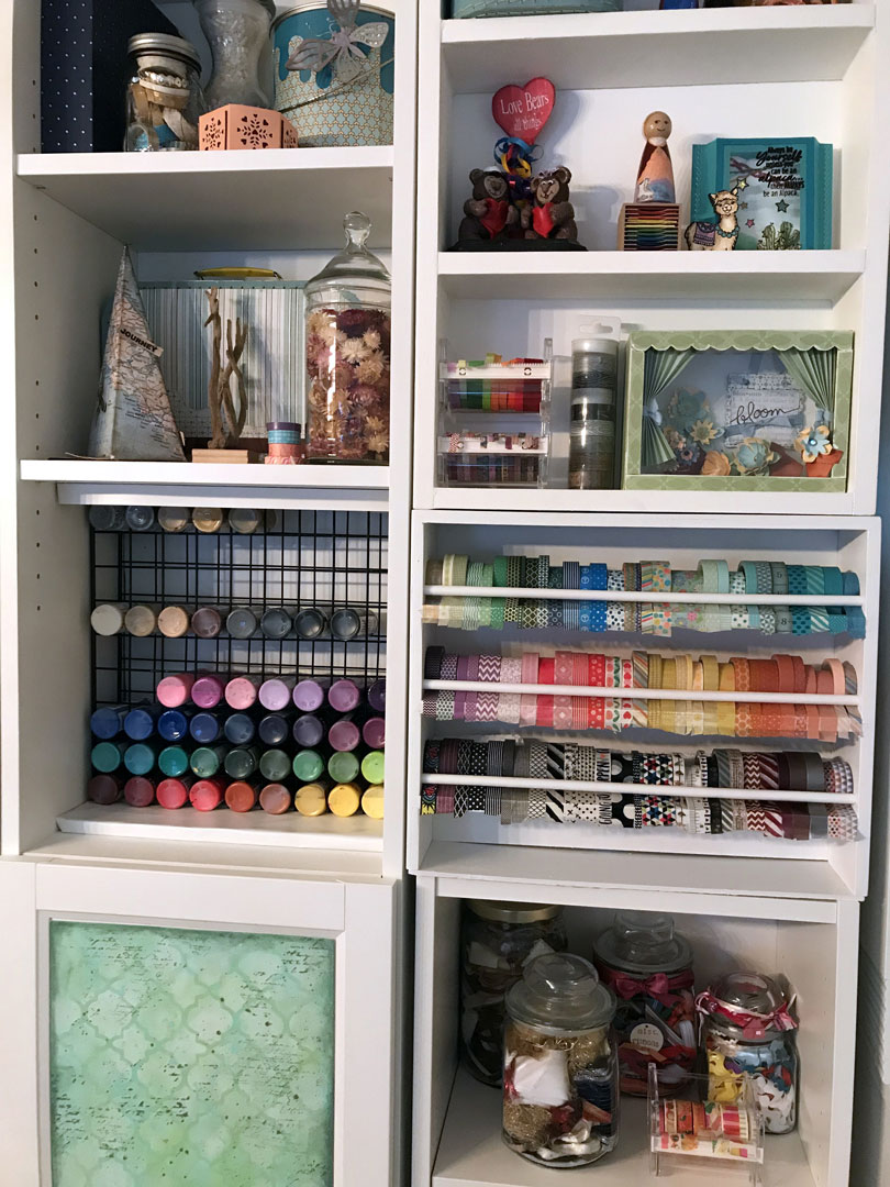 Joni uses various shelving units from IKEA® to organize supplies she wants to keep visible and easy to access. She Stores her washi tape in the Washi Tape Holder, and uses a wire rack for her paints. Other shelves are filled with her favorite decor.