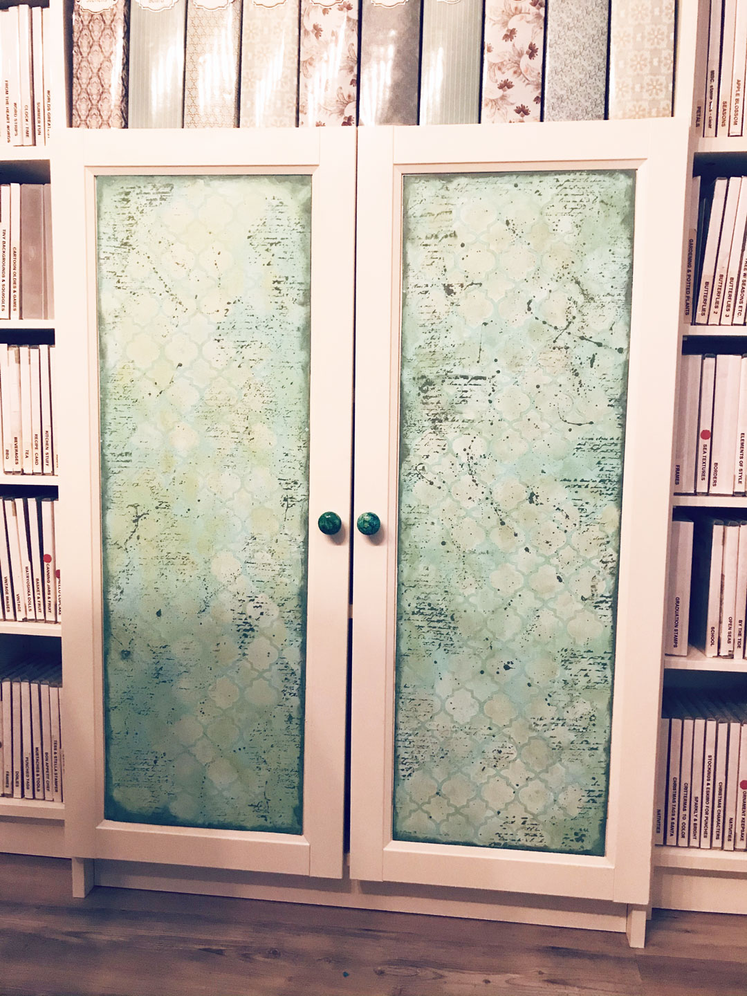 "I created the inserts by cutting left-over matboard, and first painted them with a paint which was a more intense version of my wall color. Second, I used a stencil and white Dylusions paint to stencil random areas. Third, I randomly brayered on some darker grey/green paint that I mixed with Modpodge to make the paint a bit translucent. For the fourth layer I stamped text in a variety of places using a darker grey/green paint and then used that same paint to sponge around the edges of the boards. Finally, I had a blast throwing left-over paint at the panels to create random spills and splashes. I used the same technique on a large wood board used for storing a variety of random supplies like punches and embellishments in containers with magnets."