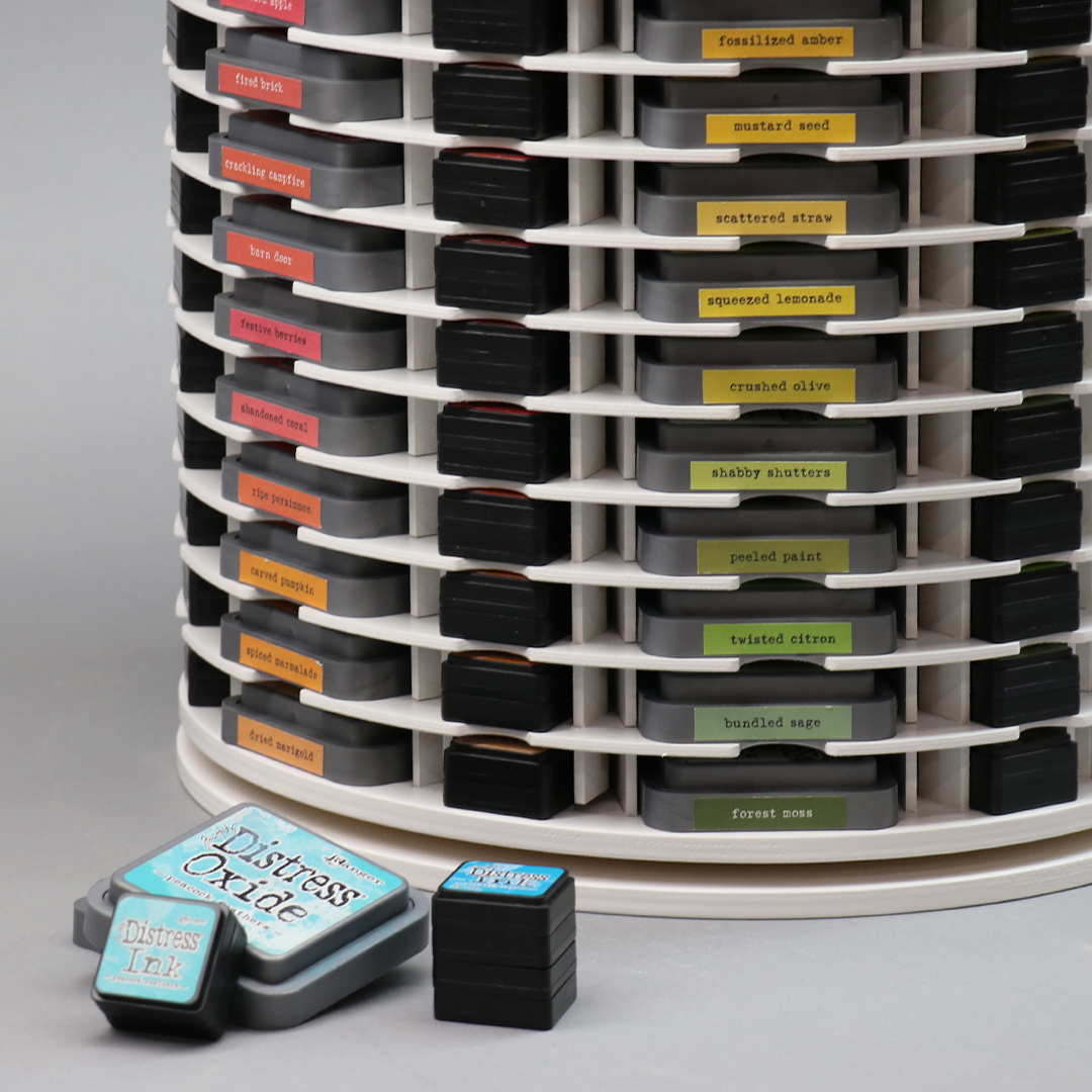 The Ink Pad Carousel is the perfect solution for storing your ink pads and cubes together! The 72 Ink Pad + Cube Carousel for Slim can hold 72 ink pads (2¾”x4”) and 72 ink cubes (1”x1”) in one IKEA Kallax Cube. The 72 Distress Carousel holds 72 full-sized Distress ink pads and 72 Distress ink cubes.