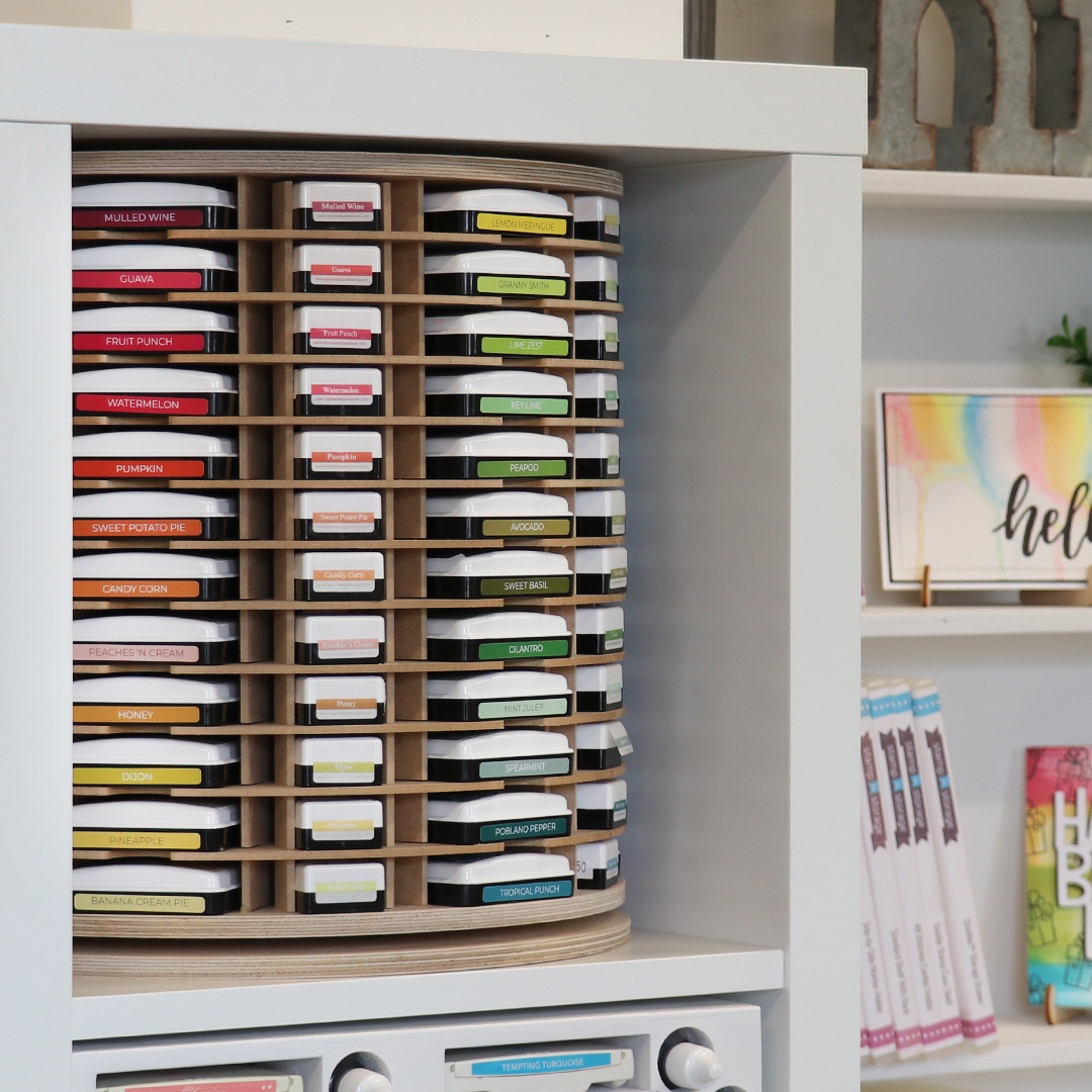 If you don’t have an IKEA Kallax Cube, don’t worry; the Carousel can sit perfectly on your desk or workstation. The 360-degree base makes it easy to find any color of ink stored in the carousel, making it convenient and functional for paper crafters of any sort.