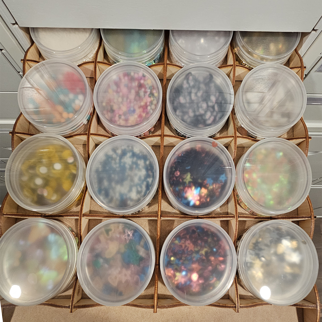 She mentions one of her favorite products is the Crafty Storage Jars with the Drawer Cabinet Grid for IKEA Kallax. She has the Drawer Cabinet for IKEA Kallax, the 2x2 Drawer Cabinet for IKEA Kallax, 8.5x11 Paper Holder for IKEA Kallax, 12x12 Paper Holders for IKEA Kallax, Paper Holder Add-On for 8.5x11 for IKEA Kallax, and Stamp Case Drawer Cabinets for IKEA Kallax in this room. We love how beautiful and colorful these are!
