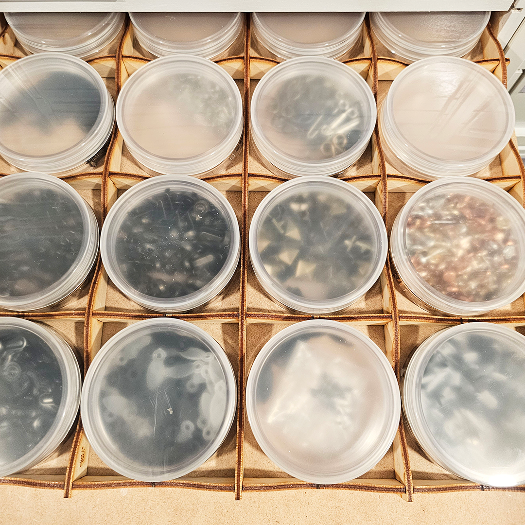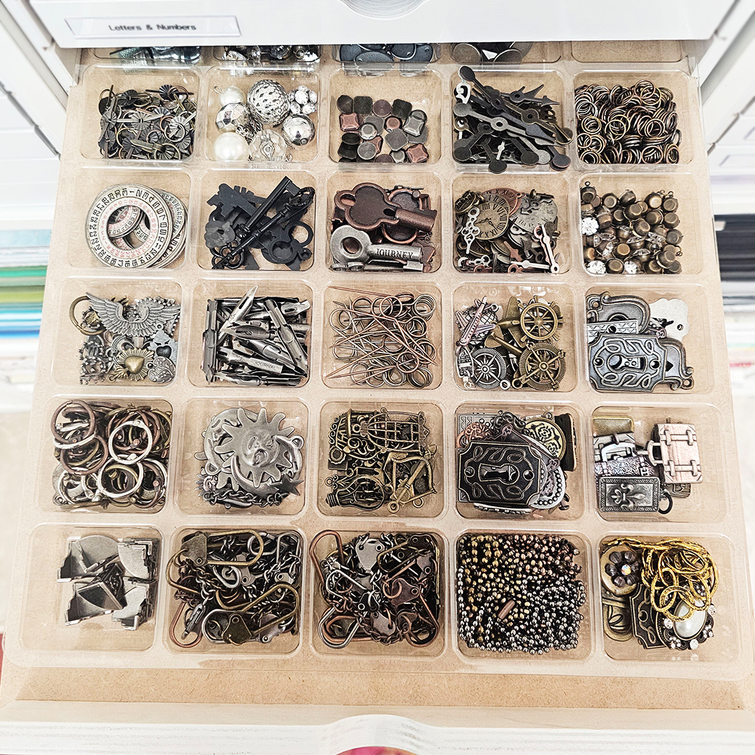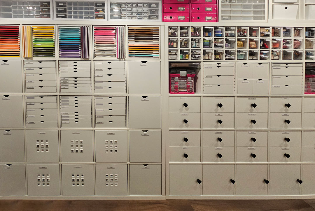She has a wall full of IKEA® Kallax units which hold her Stamp-n-Storage storage solutions. She has several Paper Holders and Drawer Cabinets in which she uses Drawer Cabinet Accessory Trays to organize her journal and scrapbook embellishments.