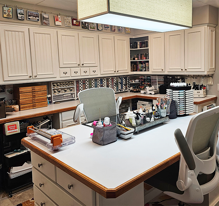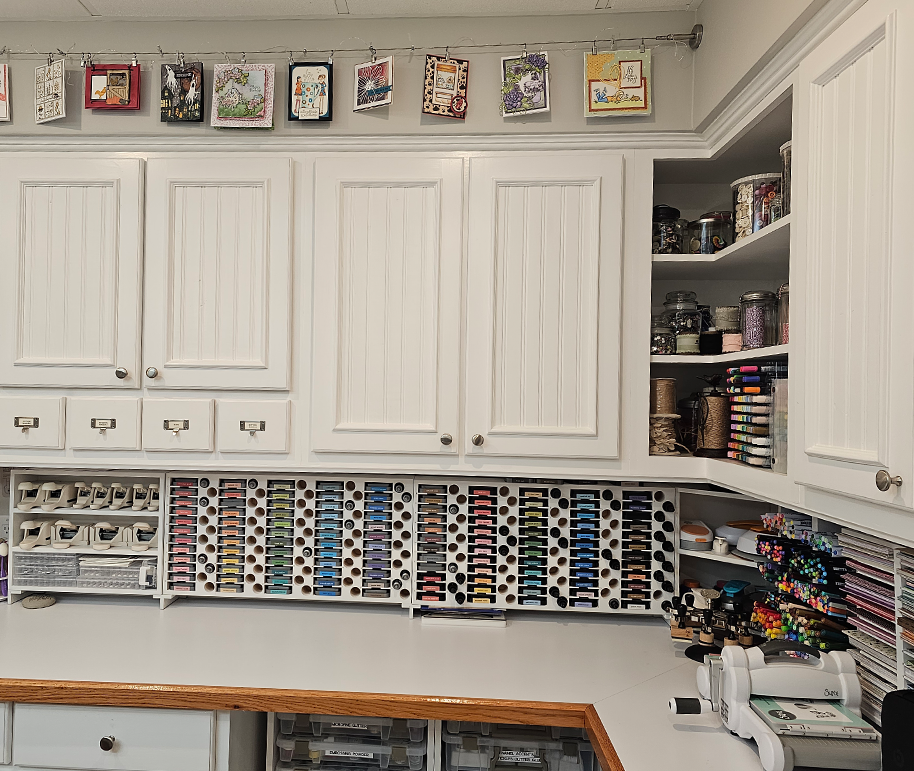 In this studio, you can see Linda's Storage Shelf, Distress Ink Pad & Refill Holders, Corner Shelf, Marker Nooks, and her 6x6 Paper Holder on the countertops along the wall. You'll also notice her beautiful collection of paper cards that she has made on display.